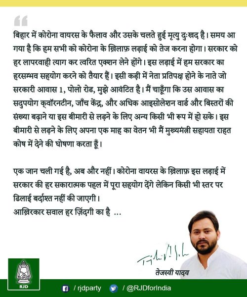 तेजस्वी का तेज पहल : एक माह की सैलरी के साथ अपने आवास को जाँच केंद्र बनाने के लिए कहा