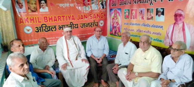 भारतीय जनसंघ के 73 वें स्थापना-दिवस पर आरा के फ्रेण्ड्स कॉलोनी स्थित कार्यालय में जिला कार्यसमिति की विशेष बैठक आयोजित हुई, जिसकी अध्यक्षता जिला उपाध्यक्ष विश्वनाथ दूबे ने की. इस अवसर पर मुख्य-वक्ता के रूप में बोलते हुए अखिल भारतीय जनसंघ के राष्ट्रीय अध्यक्ष आचार्य डॉ. भारतभूषण पाण्डेय ने कहा कि अपने स्थापना काल से ही जनसंघ देश में राष्ट्रवाद, लोकतंत्र और राजनीतिक शुचिता के लिए प्रतिबद्ध रहा है.