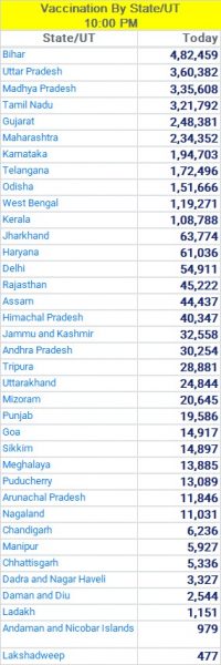 विभिन्न राज्यों में हो रहे कोविड टीकाकरण कार्य में बिहार जहां शीर्ष राज्य है, वहीं उत्तरप्रदेश दूसरे स्थान पर है. कोविड टीकाकरण कार्य में शीर्ष दस राज्यों में मध्यप्रदेश, तमिलनाडु, गुजरात, महाराष्ट्र, कर्नाटक, तेलंगाना, ओडिशा, पश्चिम बंगाल भी शामिल हैं. बुधवार तक उत्तरप्रदेश में एक दिन में जहां 3 लाख 60 हजार 382 लोगों का टीकाकरण किया गया, वहीं मध्यप्रदेश में यह संख्या 3 लाख 35 हजार 608 रहा. तमिलनाडु में 3 लाख 21 हजार 792, गुजरात में 2 लाख 48, 381, महाराष्ट्र में 2 लाख 34 हजार 352, कर्नाटक में 1 लाख 94 हजार 703, तेलंगाना में 1 लाख 72 हजार 496, ओडिशा में 1 लाख 51 हजार 666 तथा पश्चिम बंगाल में 1 लाख 19 हजार 271 रहा. अन्य राज्यों में एक दिन में हुए टीकाकरण की संख्या महज पांच अंकों में ही रही.