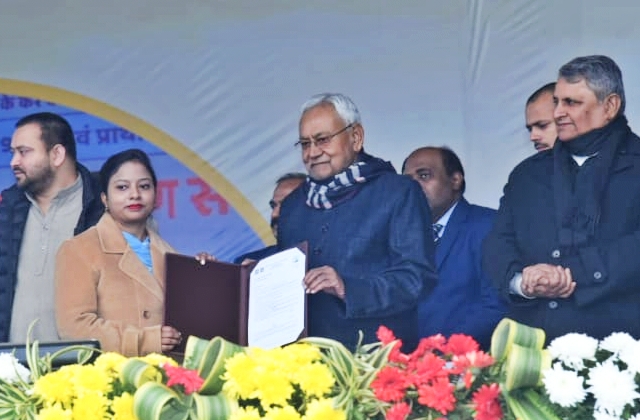 पटना 13 जनवरी 2024।। पटना के गांधी मैदान में नियुक्ति पत्र वितरण समारोह में मुख्यमंत्री नीतीश कुमार और उपमुख्यमंत्री तेजस्वी यादव के साथ शिक्षा मंत्री चंद्रशेखर ने हजारों शिक्षकों को नियुक्ति पत्र सौंपा.