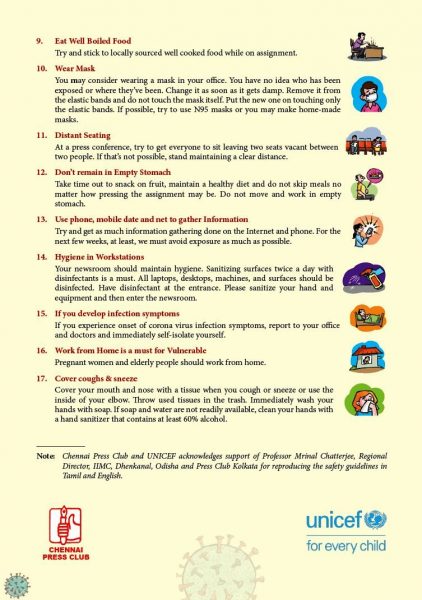 देश में covid-19 के संक्रमण काल में मीडियाकर्मियों को भी अपने स्वास्थ्य और सुरक्षा पर विशेष ध्यान रखने की आवश्यकता है .चंद उपायों के जरिये वे खुद को तो बचा सकते हैं साथ ही दूसरों तक संक्रमण फैलने से रोक सकते हैं .ज्ञात हो कि दो दिनों के अन्दर देश के कई इलाकों में मीडियाकर्मियों के जांच में covid-19 की पुष्टि हुई है. ऐसे में जरूरी है कि मीडिया से जुड़े लोग अपना विशेष ख्याल रखें .यूनिसेफ ने निम्न 17 बातों पर ध्यान देने की बात कही है