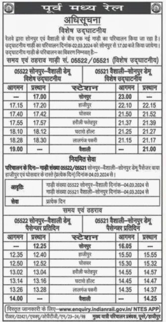 दिनांक 04.03.2024 से गाड़ी सं. 05522 सोनपुर-वैशाली डेमू पैसेंजर सोनपुर से 12.25 बजे खुलकर 14.00 बजे वैशाली पहुंचेगी तथा वापसी में गाड़ी सं 05521 वैशाली-सोनपुर डेमू पैसेंजर वैशाली से 14.25 बजे खुलकर 16.05 बजे सोनपुर पहुंचेगी. अप एवं डाउन दिशा में यह हाजीपुर, घोसवर, हरौली फतेहपुर, घटारो हाल्ट एवं लालगंज पकरी स्टेशनों पर रूकेगी.