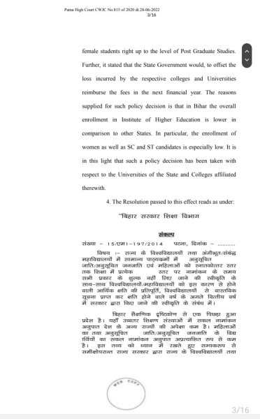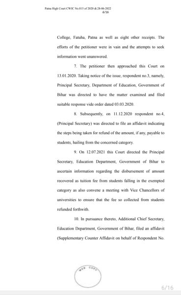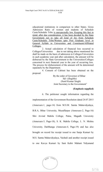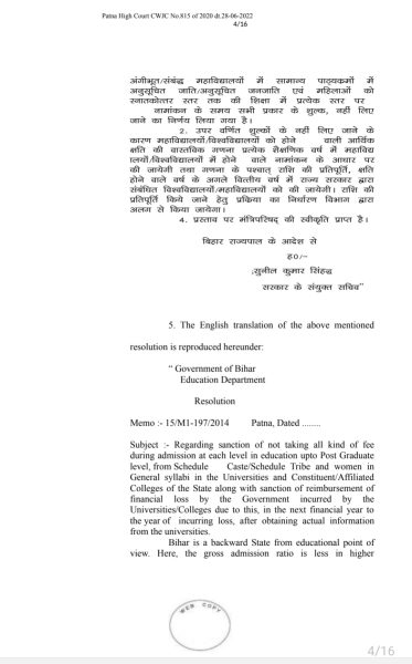 अगर कानून की माने तो माननीय पटना उच्च न्यायालय का आदेश है कि इंटर से लेकर पीजी स्तर तक पढ़ाई के दौरान छात्राओं से नामांकन के बदले में किसी भी प्रकार का शुल्क न लिया जाय. बावजूद महाराजा कॉलेज प्रशासन द्वारा यह शुल्क 1700/- से 1800/- तक वसूल किया जा रहा है.