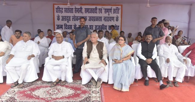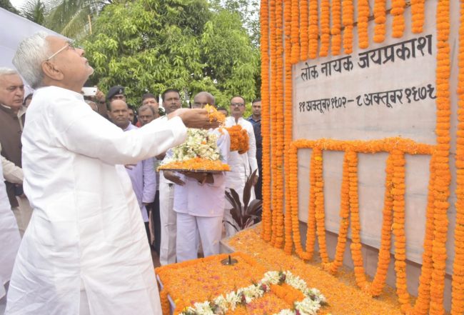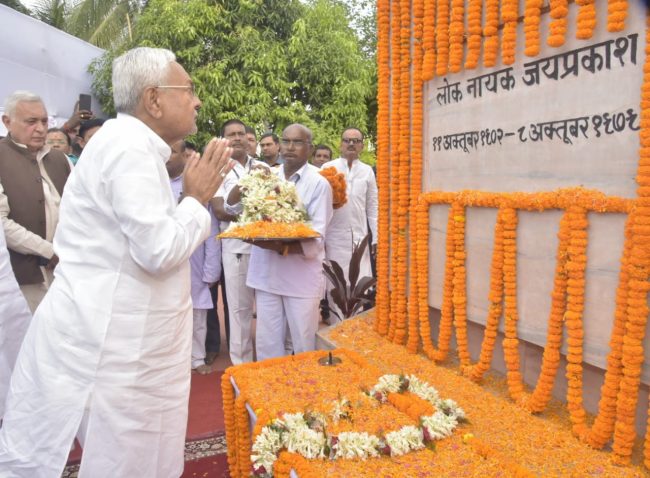लोकनायक जयप्रकाश नारायण की जयंती के अवसर पर आयकर गोलम्बर स्थित प्रतिमा स्थल पर आयोजित राजकीय समारोह में मुख्यमंत्री नीतीश कुमार ने लोकनायक जयप्रकाश नारायण जी की प्रतिमा पर माल्यार्पण कर उन्हें भावभीनी श्रद्धांजलि दी. इस अवसर पर सूचना एवं जन-सम्पर्क विभाग के कलाकारों ने आरती – पूजन, बिहार गीत एवं भजन कीर्तन का गायन किया.