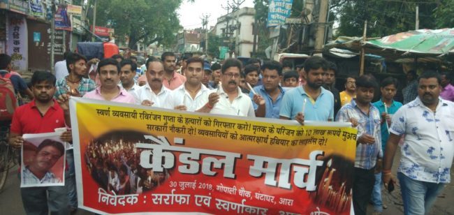 मंगलवार को स्वर्ण व्यवसायी रवि रंजन गुप्ता के हत्या के खिलाफ हत्यारों की गिरफ्तारी के लेकर सर्राफा एवं स्वर्णकार, आरा भोजपुर के बैनर तले कैंडल मार्च निकाला गया. जिसकी मुख्य मांगे रवि रंजन गुप्ता के हत्यारों को गिरफ्तार करना, परिजन को 10 लाख रुपए मुआवजा, सरकारी नौकरी और सुरक्षा की गारंटी थी. व्यवसायियो को आत्म-सुरक्षा हेतु हथियार का लाइसेंस भी देने की मांग की गयी.